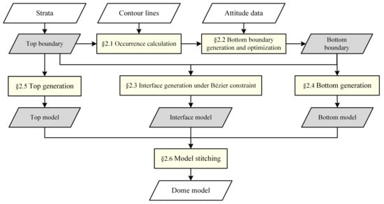 Construction process of dome structure models based on geological map. Among them, the yellow blocks represent the important steps in the modeling method described in detail in subsections below.