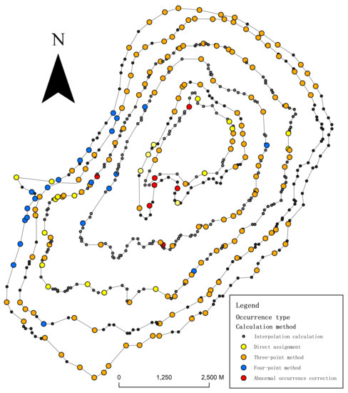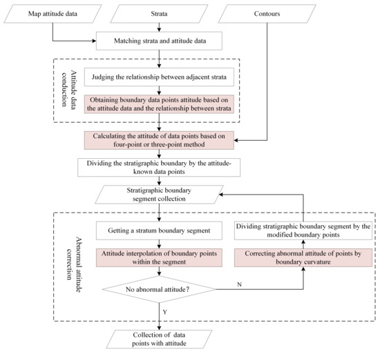 For this reason, based on the existing methods, this paper has developed an adaptive method for calculating the attitude of each point on the stratigraphic boundary. The main steps include (Figure 2): (1) based on the five geological attitude rules under different conditions proposed by Xu [11], assign the measured attitude to corresponding stratigraphic boundary points; (2) extract the intersection points of the stratigraphic boundaries and the contour lines, and calculate the stratigraphic attitude according to the three-point or four-point method, and then insert intersection points on the stratigraphic boundaries; (3) calculate the attitudes of other boundary points based on linear interpolation, and correct abnormal attitudes.