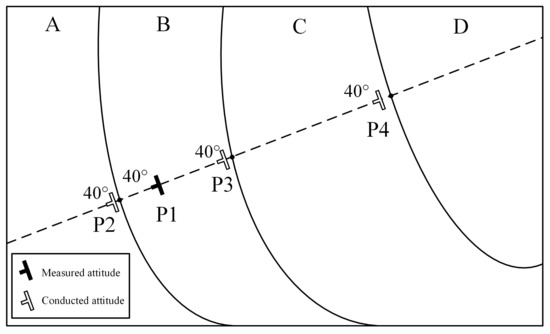 Schematic diagram of measured attitude conduction [11]. A, B, C, and D are four strata with an integrated contact relationship. Draw a straight line through the attitude point P1 along its inclination, and make the line intersects the stratigraphic boundary at points P2, P3, and P4, respectively.
