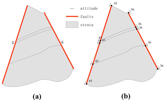 Besides stratigraphic attitude points, geological maps also contain attitude information of fault planes. A fault cuts a stratum and causes the stratum to break, forming a new stratum boundary, where the layer morphology is controlled by the fault and not transmitted to its neighbors, so the boundary here can directly give the fault attitude. As shown in Figure 4, there are faults passing through the formation, that is, two red lines in the figure. The attitude of the stratum boundary is the same as that of the fault, and the attitude of the fault interface can be directly assigned to the corresponding boundary points.