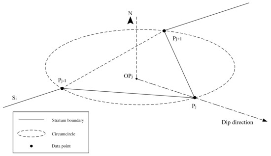 Near the stratum surfaces, the shapes of stratigraphic interfaces are constrained by the boundaries and their attitudes [38]. In this paper, each corresponding bottom point is calculated from each stratum boundary point, and then the bottom boundary is obtained by connecting each bottom boundary point in turn. Therefore, using the position and attitude of the point on the stratum boundary, the bottom boundary point can be reasonably generated.
