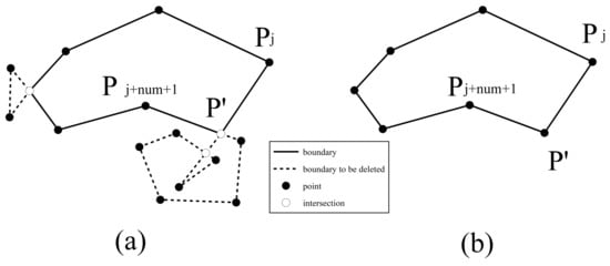 According to the characteristic that monotonic chains never intersect themselves, Yang [42] proposed a fast algorithm for judging the self-intersection of polylines based on the monotonic chain of computational geometry and an improved parallel line scanning algorithm. According to this algorithm, based on the monotonicity of the abscissa or ordinate of the adjacent boundary points (Figure 6): firstly, divide the bottom edge into several monotonic chains; then, by pairwise judging whether the monotonic chains intersect, identify potential self-intersecting points; and finally, based on any self-intersecting point, divide the bottom edge into two parts, and then identify and eliminate the bottom edge “self-intersecting ring” according to the area of the enclosed polygon. Compared with the conventional method that finds the intersection of the line segments on bottom in pairs, this method has low complexity and high execution efficiency.