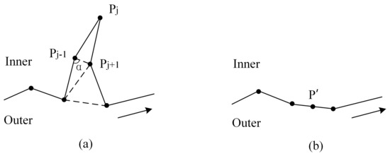 For this reason, a curve point extraction method is proposed in this paper and is based on the included angle of adjacent segments to straighten the burr line segment and generate a smooth bottom boundary. The specific idea of this processing method is as follows (Figure 7): firstly, search for the boundary point with an angle less than a certain threshold on the bottom boundary, which can be judged as a “burr”; secondly, connect two adjacent boundary points of the current boundary point to fill the included the angle, and judge whether the burr is completely eliminated according to the included angle threshold. If not eliminated, repeat this operation until all burrs are eliminated.