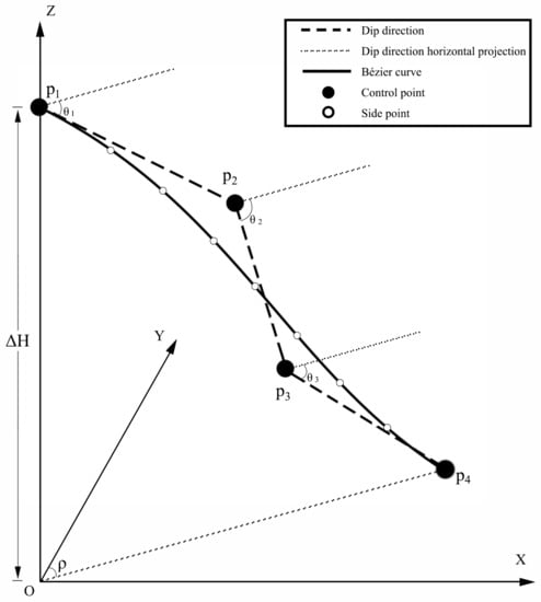 Figure 8. Side line constrained by Bézier, where , , and represent the four control points, the angle to represent the dip angle of these control points, respectively, and is their dip direction, represents the distance from to the bottom surface. - (7)