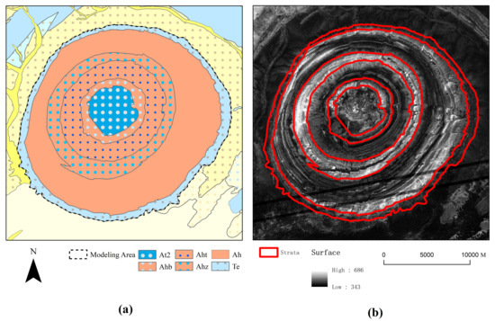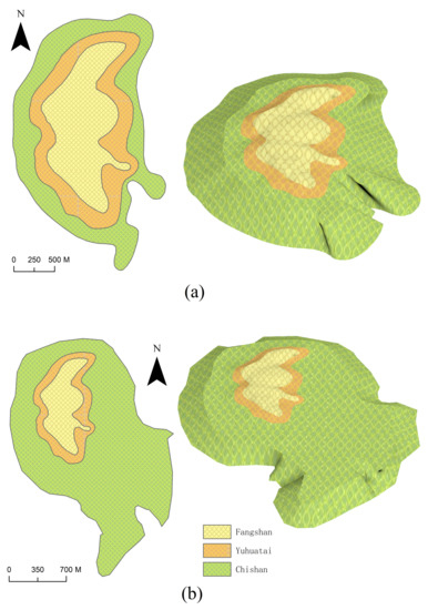 The model of Lingyanshan dome: (a) Lingyanshan modeling based on regional geological map; (b) Lingyanshan modeling based on bedrock geological map.