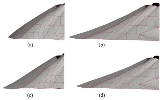 The bottom edge burr treated in this paper refers to the burr on the bottom edge calculated by a group of continuous data points on the top boundary without burr. It may cause the interface to form a long and narrow bending structure with sharp inward depression or outward protrusion in the longitudinal direction. The bottom burr is shown in Figure 7a. Generally, the unexposed conformable contact stratum layer will not form burr without experiencing severe structural deformation. However, when the difference of the dip direction between two adjacent boundary points on top is large, burrs may appear on the bottom edge. In addition, after the process of eliminating self-intersection on the bottom edge, burrs may also appear. The existence of burrs due to the bottom boundary generation will cause the generated stratum interface not be smooth enough, which will have a greater impact on the quality of the constructed 3D dome model. It should be pointed out that those burrs (thin valleys, canyons, etc.) produced by erosion generally appear on the exposed stratum erosion surface, on which this method will not be used.
