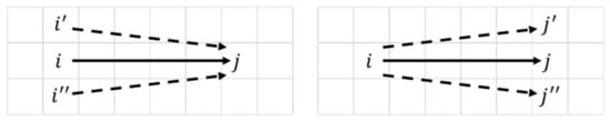 Considering the spatial spillover effect of criminal trips described above, residential burglars who select the same destination zone come from neighboring origin zones. This tendency is referred to as the origin-based spatial spillover effect [] and is shown in the left-hand side of Figure 1. The solid arrow from origin i to destination j represents the observed criminal trip on a particular OD pair, and the dashed arrows represent criminal trips on OD pairs that are spatial neighbors of the solid arrow. This spillover effect may relate to the flag account because travelers living in the neighboring origin i are assumed to be different offenders, and this diagram indicates that a specific destination (i.e., destination j) is chosen repeatedly by different offenders.