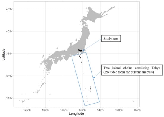 The prefecture of Tokyo, which is the capital of Japan, was selected as the study area. The estimated residential population of Tokyo is more than 13 million people, and its area is about 2194 km2. Tokyo is commonly divided into three regions: 23 special wards in its eastern part, the Tama region comprising 26 cities, three towns, and one village in its western part, and two island chains—the Izu Islands and the Ogasawara Islands—in the Pacific Ocean. However, these two island chains were omitted from the study area because they are more than a hundred kilometers from the mainland.