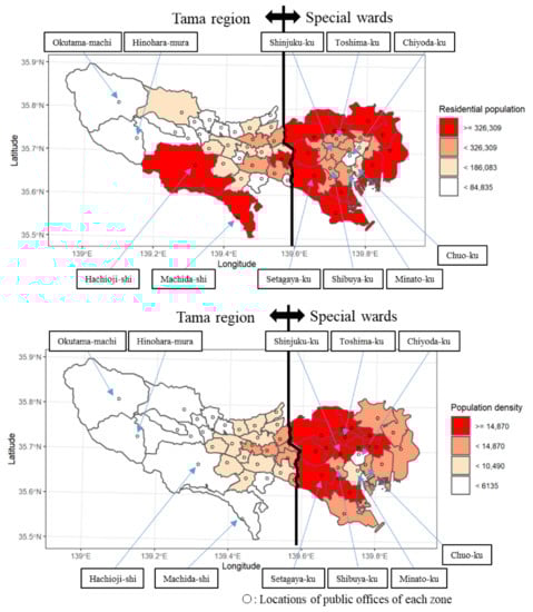 The study area was divided into 53 administrative districts (municipalities), namely, 23 special wards, 26 cities, three towns, and one village. Each of these 53 municipalities was regarded as an analytical unit and is referred to hereinafter as a “zone”. Figure 2 shows the location of the study area, and Figure 3 shows choropleth maps of the study area colored by the size of the residential population and population density of each zone. These choropleth maps were created from the census of Japan in 2010. The small circles within each zone displayed in the choropleth maps indicate the locations of public offices. Chiyoda-ku (“ku” means “ward”) is a ward that contains many central political institutions. Although many people commute to Chiyoda-ku, its residential population and population density are the smallest of the special wards. Chuo-ku and Minato-ku located adjacent to Chiyoda-ku are also political and economic centers of Japan, and these three wards are commonly referred to collectively as the “center of Tokyo”. Meanwhile, Shinjuku-ku, Shibuya-ku, and Toshima-ku are commonly referred to collectively as the “subcenter of Tokyo”, which is the commercial center. Setagaya-ku located in the southwestern part of the special wards has the largest residential population in Tokyo. In contrast to the special wards, the Tama region is commonly regarded as the suburb area. The zone with the largest residential population in the Tama region is Hachioji-shi (“shi” means “city”), which is located in its southwestern part. Hachioji-shi has the third-largest residential population in Tokyo. The zone with the second-largest residential population in the Tama region is Machida-shi, which is located adjacent to Hachioji-shi. While Hachioji-shi and Machida-shi have larger residential population in the Tama region, the population density of these cities is relatively small. The zone with the smallest residential population in Tokyo is Hinohara-mura (“mura” means “village”), and the zone with the second-smallest residential population in Tokyo is Okutama-machi (“machi” means “town”). These are located in the western part of the Tama region.