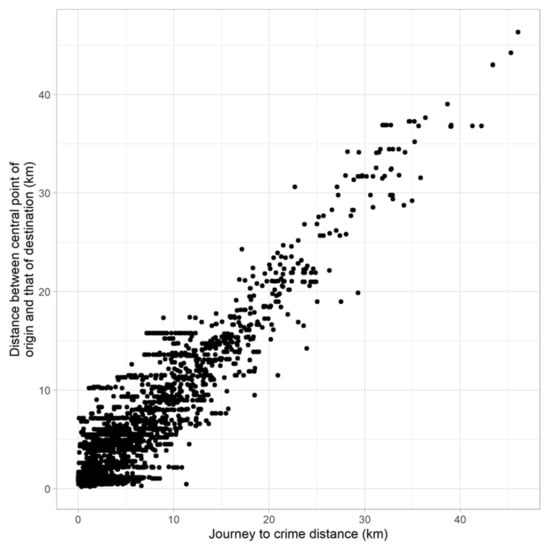 The second limitation concerns the analytical unit. The results of the current study showed that more than half of the criminal trips of the current sample (54.6%) were between municipalities when crime was being committed. Furthermore, a high correlation between the journey-to-crime distances and the transformed distances (i.e., distances from the central point between origin and destination zones) was observed in the current sample (see Figure 4). These results justify defining municipalities as the analytical unit. However, a line of research investigating the relationship between destination-specific factors and location choices of offenders has defined the analytical unit as more detailed zones because the journey-to-crime distances are relatively short [,,,]. In addition, the spatial patterns of crimes are highly concentrated and are highly stable in specific micro places over time [,,,,,,]. Moreover, Figure 4 shows that larger error distances were observed between the journey-to-crime distances and the transformed distances on a shorter distance scale.