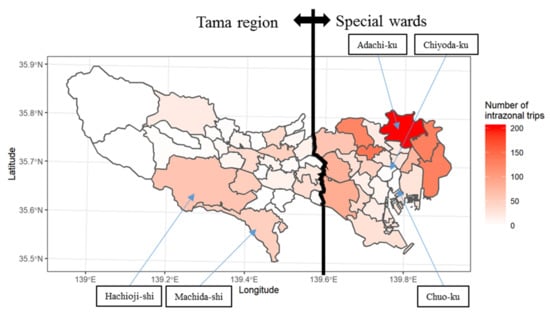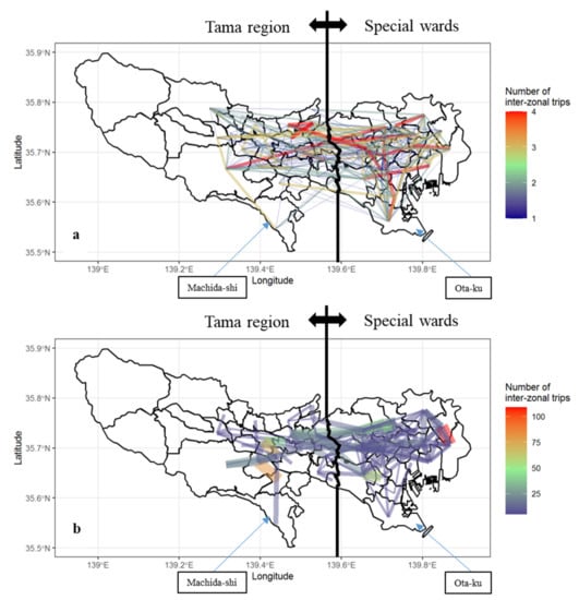 As shown in Figure 6a, for the OD pairs with few interzonal trips, some had longer distances; for example, some OD pairs connected Machida-shi in the southern part of the Tama region with several zones in the special wards, and some connected Ota-ku in the southern part of the special wards with several zones in the Tama region. However, as shown in Figure 6b, for the OD pairs with five or more interzonal trips, almost all had shorter distances; for example, the OD pairs connected with Machida-shi were not connected with the special wards, and the OD pairs connected with Ota-ku were not connected with zones in the Tama region.