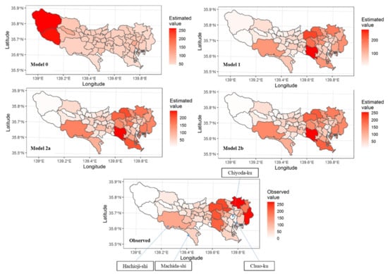 To visualize the spatial patterns of the estimated total incoming trips, the estimated number of those trips for each zone was calculated. For comparison with these estimated values, the observed number of total incoming trips of each zone was obtained, and the results are shown in Figure 7. The zones colored bright red are those with a high estimated or observed number of total incoming trips. The spatial pattern of the estimated total incoming trips with Model 0 was completely different from that of the observed total incoming trips. However, the spatial patterns of the estimated total incoming trips with Model 1, Model 2a, and Model 2b were similar to those of the observed total incoming trips. In particular, these three models estimated larger numbers of total incoming trips for the special wards, except for Chiyoda-ku and Chuo-ku. In addition, Hachioji-shi and Machida-shi in the southwestern part of the Tama region were estimated as having larger numbers of total incoming trips compared to the other zones in the Tama region. These tendencies were similar to the spatial pattern of the observed total incoming trips.