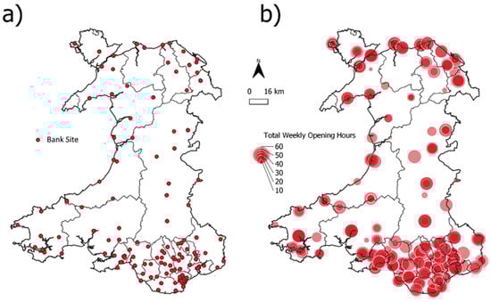 Recently in the UK, retail bank branch closures are having a profound influence on the vitality of town centers and significant potential impacts upon customers who are dependent upon the types of financial services that they offer. Similar concerns regarding diminishing access to banking services and potential financial exclusion for socio-economically disadvantaged individuals or households have been expressed in other international contexts [,,,,,,,,,]. In the UK, the impact assessments provided by banks to justify a branch closure and signpost alternative sources of provision have been criticized by some commentators in evidence to parliamentary enquiries as being “after the horse has bolted” type statements that lack any true public input into decision-making processes leading up to an announced closure []. In terms of future service arrangements, the information provided is often limited to signposting the nearest post office branch offering limited financial services, the level of broadband availability in the local vicinity, and the extra distance or time needed to reach the next closest branch of that bank. Some include information on the availability, frequency, and duration of a bus service or other public transport options needed to reach replacement facilities, but most do not.