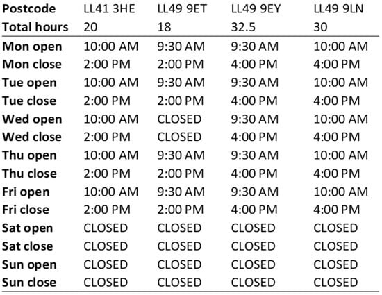 At the time of study, no freely available dataset existed in the UK to provide information on branch opening hours. Services such as the Google Platform API [] can provide this data at a set cost per query, but alternative approaches are available that avoid such cost implications. In this instance, it is possible to obtain branch opening hours through each bank brand’s dedicated “branch finder” website, or alternatively via websites that provide collective information [,,]. We chose to adopt a web scraping solution to gather data from these sites whilst adhering to the terms and conditions of each website and respecting the ethical concerns outlined in previous studies [].
