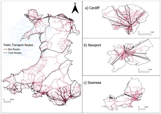 We acknowledge the following sources of data: The Traveline National Dataset (TNDS) (Wales) contains public sector information licensed under the Open Government License v3.0. OpenStreetMap data was downloaded from https://www.geofabrik.de/, (accessed on 28 April 2021) and these data are licensed under terms of the Open Database License (https://www.openstreetmap.org/copyright). Office for National Statistics, 2011 Census: Aggregate data (England and Wales) (computer file). UK Data Service Census Support. Downloaded from https://www.nomisweb.co.uk. These data are licensed under terms of the Open Government License (http://www.nationalarchives.gov.uk/doc/open-governmants-licence/version/2) (all accessed on 28 April 2021).