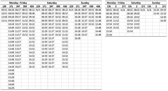 Figure 3 illustrates the public transport network derived from GTFS data that was then utilized by Open Trip Planner to compute travel times between supply and demand sites, as required for FCA modeling. Examples of route schedules are demonstrated in Figure 4. A total of 900 bus and light rail services and 439 heavy rail services operated across Wales at the time of the study. All had fixed routes and scheduled operating times that imposed constraints on the possible routes existing between OA demand centers and bank and building society branches at specific times of the day or week. Furthermore, when OTP is asked to compute a route, a maximum walking distance is specified in respect to reaching a transit stop, possible interchange between services, and getting to the final destination point as alluded to earlier. Based on findings from previous research [,,,], we adopted a value of 5 min or 400 m for this parameter. In other words, trip times are only returned by OTP if they do not exceed this limit within any of the three situations listed above.