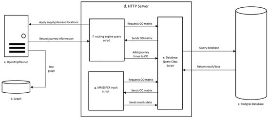 The most critical component of the system is the routing engine (item a in Figure 5) that constitutes a part of Open Trip Planner (OPT). OTP is free and open-source software (FOSS) that can be used to calculate routes and journeys from origin to destination for multiple transport modes []. Given sufficient information, OTP can compute results for private car; walking and cycling; and for public transport via bus, light rail, heavy rail, and tram. OTP analyzes a graph (item b in Figure 5), which is a topological network it constructs for itself from public transport data supplied in GTFS format and from a network of roads and footpaths sourced from OpenStreetMap []. Once fully configured, viable routes are returned for queries issued through its RESTful API. These are obtained by submitting URLs carrying parameters to identify the desired mode of travel; the journey start and end points; and any time constraints, such as the need for departure or arrival within a stated timeframe. Computed routes are based on Dijkstra’s algorithm and the A-star algorithm. Journey times for private car are based on road speeds supplied in OpenStreetMap data, and no account is made for potential congestion. Journey times for public transport are computed directly from the GTFS timetables.