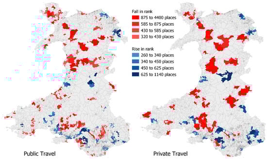 To better isolate and focus upon the impact of the additional temporal capacity refinement, all FCA scores were first ranked, and then the difference in ranking between the models was determined. Those OAs whose rank increased or decreased the most when a temporal capacity was introduced were identified and mapped (see Figure 6) to highlight where such impacts were the greatest. OAs exhibiting a substantial drop in rank were found to be almost exclusively located in remote rural areas of Wales. This evidence supports the suggestion that, although some rural branches may have remained open rather than closing altogether over recent years, their increasingly limited operating hours have most likely impacted upon the quality-of-service provision being experienced within rural communities. Whilst some differences are evident between private-transport and public-transport users, with public travel tending to show impacts in the more remote areas, the overriding pattern remains much the same, and this is reasonable given that both cohorts seek access to a common set of service delivery points offering the same hours of service. OAs showing a substantial rise in rank were concentrated in major urban areas and town centers; this is what might be expected, suggesting that the most generous branch opening hours occur where the population base is most able to sustain this high level of service provision. Overall, patterns displayed in Figure 6 highlight the potential bias that may exist in previous FCA studies that fail to account for service operating hours, and they also clearly suggest a rural–urban divide in respect to this issue.