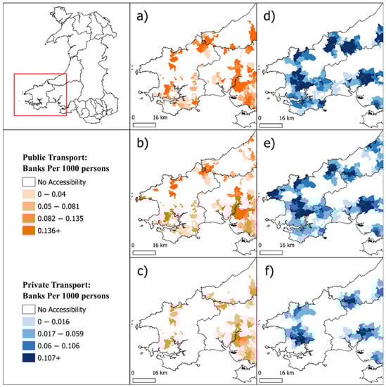 To illustrate potential outcomes, we selected three different time periods on three different days—, Tuesday at 11 a.m., Friday at 2 p.m., and Saturday at 11 a.m. The first is a time when most branches were known to be open, the second is a time when it was anticipated that the restricted workday hours of some branches would be likely to have an impact, and the third was selected to help illuminate the limited availability of banking services on the weekend. Simultaneously, public transport schedules and frequencies are also likely to play a significant role in the third scenario. We focused the maps upon the Pembrokeshire peninsular to better depict the level of detail revealed at the OA level. A common legend is used for the set of public-transport FCA scores (Figure 7a–c), and again for the set of private transport scores (Figure 7d–f); however, the breakpoints vary between the two modes.