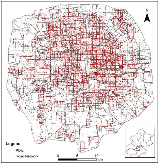 Beijing, the capital of the People’s Republic of China, was selected as the research area. It is a modern, world-famous, international city, and it has a complicated spatial structure. The study area is within the Fifth Ring Road of Beijing, which contains various developed urban functional regions. A map of the study area is shown in Figure 1.