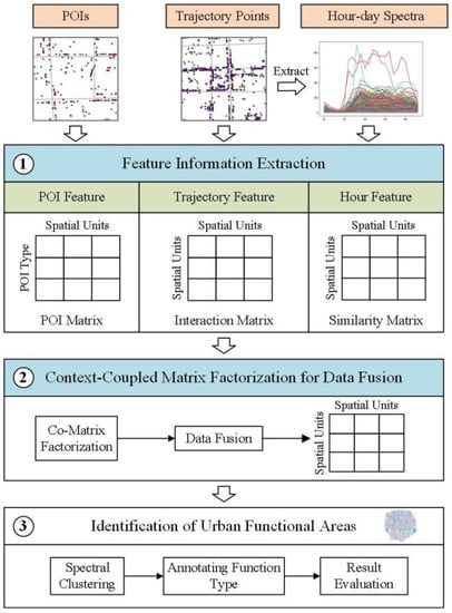 In order to address the sparsity issue and mine the common information, a data fusion method named context-coupling matrix factorization (CCMF) was proposed to compensate for the problem of information sparsity by considering the contextual relationships among multiple data sources. First, information extraction is performed based on POI data and taxi origin–destination (OD) trajectory data. Semantic information is derived from the POI data, while spatial interaction and time–frequency information are extracted from the taxi OD trajectory data. Secondly, the CCMF method is used to mine common information among the data sources to be fused into integrated data to identify UFRs. Finally, spectral clustering was adopted to identify UFRs.