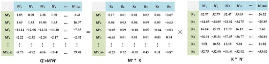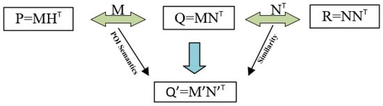 The correlation between two spatially close objects is stronger than that between two remote objects. The OD interaction, POI, and OD time–frequency matrices are decomposed simultaneously. Then, their shared interaction matrix M for feature semantics and interaction matrix N for feature similarity are formed. The shared information M between the OD interaction matrix Q and the POI matrix P is the POI type similarity between different regions. POI types can assist to the determination of urban function. The rows of matrix P represent the POI type in this region, and the columns represent the unit location. Then, the two columns represent the similarity of the POI type in different regions. Through fusion, POI types are shared in order to compensate for semantic missingness. The shared information N by the OD interaction matrix Q and the OD time–frequency matrix R is the similarity of the interaction time between cells. One row of matrix R represents a unit, and one column represents the change in OD frequency of this unit over time. The two columns in matrix R represent the similarity of people’s activity time between the units, and the similarity of the interaction times between units can be shared after fusion. Through fusion, the similarity of the interaction times between units is shared in order to compensate for the difference in residents’ activity times. The formula is as follows []: