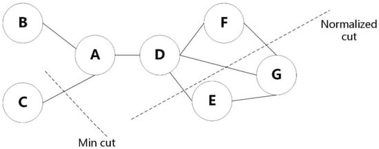 - Perform undirected graph division. The matrix is first transformed into the form of a graph by considering regions as objects of the graph, and considering similarity as weights to connect them (Figure 4). In the figure, “Min cut” denotes the segmentation with the smallest cut edge, and “Normalized cut” denotes the segmentation of approximately the same size with the smallest cut edge. According to the graph cut idea, the first K eigenvalues of the similarity matrix are found, and then the corresponding eigenvectors are found.