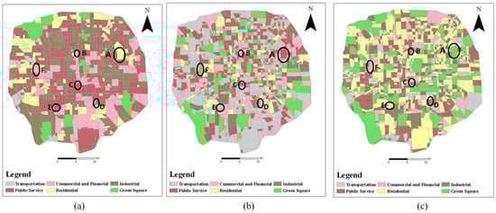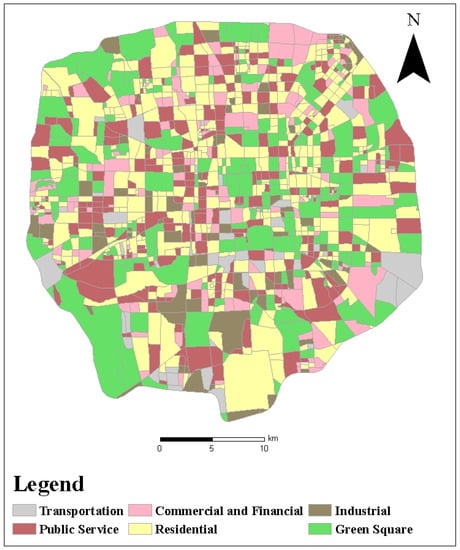 (3) POI data consist of point data with geographical information portraying real-world objects, whether 2D or 3D, indoor or outdoor []. POI data usually have fine spatial granularity and are widely used to delineate people’ activities. POI properties comprise names, categories, latitudes, and longitudes. Approximately 147,158 records about POIs in 2018 were collected from the Gaode map API (http://lbs.amap.com/, 29 March 2022), containing 22 categories and sub-categories. Following Chinese technological specifications (GB50137-2011), the POI data were re-classified as residential, public service, commercial and financial, industrial, green square, and transportation data (Table 2). In our work, the POI data were used to determine the types of UFRs.