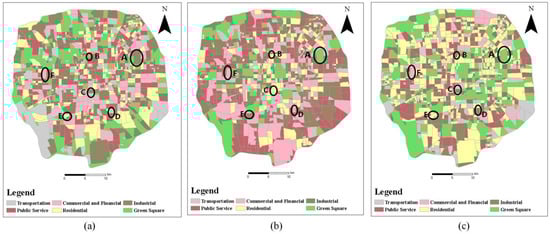 The proposed CCMF method was used to fuse POI and taxi OD data. The CP method was used for clustering. Then, following the urban land use field investigation in China and the Chinese technological specifications (GB50137-2011), the urban land was divided into six clusters: residential, public service, commercial and financial, industrial, green square, and transportation. The distribution of functional regions is mapped in Figure 6. Table 3 shows the CP values of POIs in different clusters.