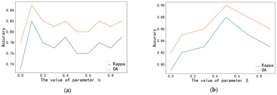 Influence of the parameters on the overall accuracy and the kappa value: (a) parameter ; (b) parameter .
