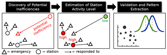 We now present DAPI, the proposed tool for the discovery and analysis of potential inefficiencies in medical emergency response data, addressing the aforementioned objectives. The source code for DAPI is publicly available at https://github.com/thomastiamleept/dapi/ (accessed on 22 May 2022). DAPI is divided into three phases: (1) discovery of potential inefficiencies, (2) estimation of station activity levels, and (3) validation and extraction of patterns. In the first phase, real-world emergency vehicle dispatch data is used as an input, and potential inefficiencies are efficiently identified based on the spatial distributions of each station’s historical responses and road distances. In the second phase, activity levels of each station over time are inferred from the historical data based on the distributions of the number of responses and the estimated number of active vehicles. Finally, the third phase analyzes the correlation of potential inefficiencies with activity levels of closer stations using solid statistical principles. A pipeline of the approach is shown in Figure 2. The following subsections describe each phase in detail.