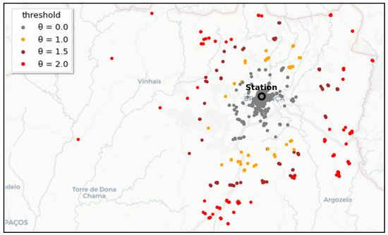 All responses whose Mahalanobis distance to the responding station’s distribution is greater than or equal to a threshold are identified and added to the list of candidates for potential inefficiencies. In DAPI, by default, though this can be adjusted according to the desired sensitivity. The Mahalanobis distance can be interpreted as the number of standard deviations away from the center. The threshold is chosen as a conservative value to cover responses that are statistically farther away from the usual coverage of the responding station yet are not necessarily outliers. Figure 3 shows responses made by a station, with the potential inefficiency candidates highlighted for different values of .
