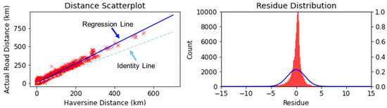 The linear model for road distance estimation can be fitted to a random sample of the data. Figure 4 shows, in a sample in our dataset, (a) the relationship between the Haversine distance and the actual road distance, with a least-squares regression line fitted for prediction, and (b) the residue distribution of said linear model. Note that can be selected based on the residue distribution. In the most conservative case, the minimum value could be selected, but a percentile can be used in the case of prevalent outliers.