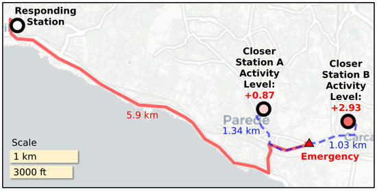 In running the algorithm, we consider a 2 h time window ( 2 h) in detecting the activity level of a station at a given time. (15 days) is used for estimating the number of unique vehicles. In addition, in the case of ambulances, we restrict the identification of closer stations to those in the same municipality as the emergency to respect operational jurisdictions. The responding station, however, can be from other municipalities. Finally, we apply an hourly segmentation for the normalization of the RPV to account for possible differences in the availability of vehicles at different times of the day.