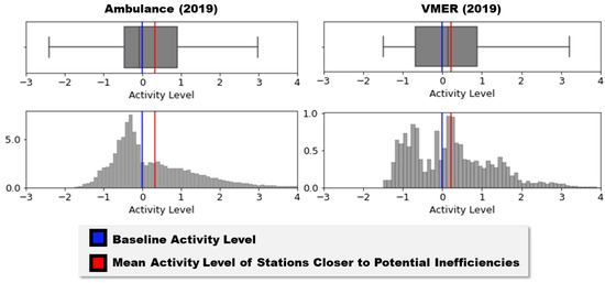 Table 1 shows the results for the years 2017–2019. From here, we can see that a substantial amount of potential inefficiencies have been detected consistently for both ambulances and VMER. Furthermore, findings per year consistently confirm that closer emergency stations had significantly higher levels of activity than usual when those inefficiencies happened. To illustrate further, Figure 7 shows the distribution of activity levels of closer stations during potential inefficiencies in 2019. Here, it can be seen that closer stations more often exhibit positive activity levels in these time frames. These provide compelling evidence that as a whole, potential inefficiencies are correlated with high levels of activity and, consequently, high levels of demand for medical emergency services.