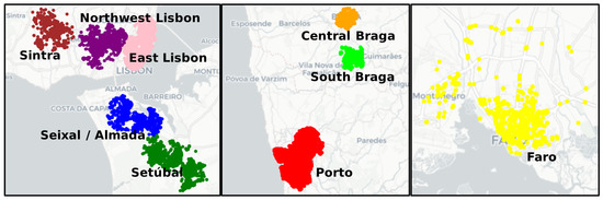 Figure 8 shows the pertinent clusters of potential inefficiencies identified for the entire year of 2019 considering ambulances, while Table 2 shows the statistics of the activity levels of closer stations for each area cluster. From here, we can see that the largest concentration of potential inefficiencies are detected around the Porto area, while there are eight other identified clusters around Portugal. Most of these areas, expectedly, are included in the most populated areas of Portugal, with the exception of Faro. Nevertheless, Faro is a popular tourist destination.