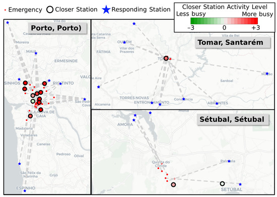 In Porto, there was a large concentration of emergencies that happened on a single day. A majority of these emergencies were intoxication-related, which was likely due to a big holiday on that date. Most closer stations had very high activity levels during these emergency occurrences. However, there was one station that had a negative activity level. These instances were mostly from emergencies that happened in the morning hours (12 a.m. to 8 a.m.), where said station was not able to respond, despite evidence in the data that it can dispatch responses in those hours. This means that this station was not able to respond on the 1st of January due to some uncertain factor. On the other hand, in Tomar, there was also an unusually high number of emergencies on a day that coincides with a local festival. In total, 38 emergencies occurred, compared to the daily average of 14.22. This was likely the reason why faraway stations were called to respond to some of them. Finally, in Setúbal, there was a day when a high concentration of potential inefficiencies occurred. In this case, the activity levels of the two closer stations were not consistently positive. In the case of the closer station, while it had a positive mean activity level, this was influenced by only a few instances with very high values. As such, overall, there was no statistically significant divergence from the baseline for this cluster, suggesting that these potential inefficiencies are not caused by high activity, but by other factors.