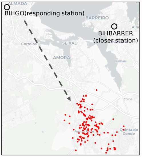 Unlike the case for ambulances, potential inefficiencies among VMER responses are fewer and far between. Nevertheless, there are six area clusters that exhibited a large number of potential inefficiencies. However, most of them are not systematically correlated with high activity levels in closer stations. These dense clusters of potential inefficiencies are likely due to some operational jurisdictions observed by the management. For instance, Figure 10 shows emergencies in the Sesimbra cluster. In most of these emergencies, the closest station is BIHBARRER, and yet it was consistently BIHGO station that made the dispatch.