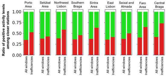 Figure 11 shows, for each cluster, the ratio of positive activity levels among closer stations within the time windows of the potential inefficiency occurrences, compared to the ratio of positive activity levels among the same stations over all time windows. Among these, differences are most apparent in Cluster I (central Braga) and Cluster H (Faro). This provides further evidence that, in general, closer stations are busier than usual during the occurrence of potential inefficiencies.