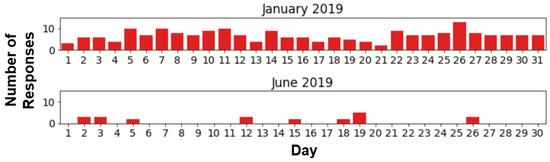 From here, we can see that three out of the four stations generally have high activity levels in the presence of potential inefficiencies. The exception is BIBRAGA2, which has a relatively low mean activity level. Furthermore, this station had a positive activity level in only 32.66% of the potential inefficiency cases. This suggests that, in general, this station is unable to respond to emergencies, not because of high load, but due to other unknown factors, such as the irregularity of service schedules, lack of staff, or other context-dependent reasons. Nonetheless, it is important to visualize these stations for stakeholders to gain a better insight into the dynamics of potential inefficiencies within the system. In fact, the BIBRAGA2 station has apparent irregularities in response in some periods of time, as shown in Figure 12, where the number of responses became evidently sparse in June 2019. Without further contextual information, it is impossible to determine whether this was caused by the unavailability of vehicles, conscious operational decisions, or other reasons.