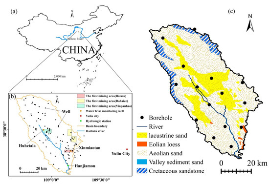 Location of the study area: (a) Location of the studied river basin in China; (b) Location of wells, hydrological stations, and first mining areas of coal mines in the basin; (c) Borehole drilling sites and geological background.