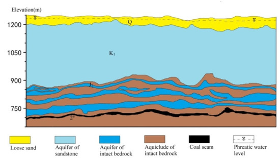 The average thickness of the upper Quaternary loose rock soil is approximately 50 m. The thickness of the Cretaceous sandstone aquifers is approximately 350 m. Between the main 2# coal seam and the Cretaceous floor is a special aquifer group formed by the alternate deposition of sandstone aquifers and impervious layers, which is the main source of mine water inrush [41]. The thickness of this special aquifer group is approximately 180 m. The Jurassic 2# coal seam in the study area is the first mining coal seam with an average thickness of 5 m (Figure 2). Restricted by the paleotopography during deposition, the thickness of each stratum in the basin varies greatly [42]. Generally, the strata are the thickest in the paleochannel and low-lying center, gradually thinning to both sides, and nip-out at the watershed [43]. However, the thickness of Quaternary strata gradually decreases from downstream to upstream, and the thickness of some beach land in the middle of the basin increases. The thickness of Cretaceous strata gradually increases from downstream to upstream, forming a large aquifer. Among them, there is no continuous and effective aquifuge between Quaternary and Cretaceous aquifers, but there are multiple aquifuge and aquifer alternations in the Jurassic strata [44]. Therefore, the aquifer above Cretaceous strata is regarded as a water-rich layer, and the aquifer below is regarded as a weak aquifer. Based on the above, the Quaternary and Cretaceous strata in the study area can be regarded as a unified phreatic aquifer group. The Quaternary and Cretaceous aquifer groups have different thicknesses, but they generally exhibit a continuous distribution. Stratigraphic integration is relatively gentle among the Jurassic strata, and the 2# coal seam is also evenly distributed in the basin because of the stress action of the upper strata [45].