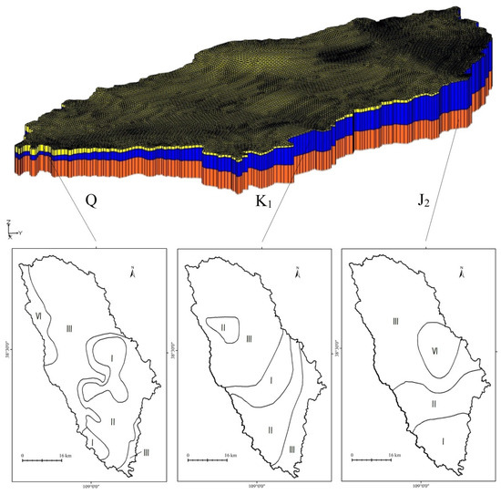 According to the characteristics of aquifers in the watershed and the distribution of the groundwater flow field, shallow water aquifers in the watershed were divided into flow boundary and closed boundary aquifers. Along the streamflow direction of groundwater, the north of the watershed is the recharge boundary, and the south is the discharge boundary. The Hailiutu River receives water from continuous groundwater discharge, and it was thus simulated as a drain [21,36]. In order to characterize the discharge process of the river in detail, the river course was divided into 7 sections, and the actual flow was measured in each section. The measured average flow was input into the model. The phreatic aquifer in HRB is directly recharged by atmospheric precipitation. As the sandy land is characterized by a high infiltration rate, scarce vegetation on the surface, and low evaporation capacity, the free surface of the phreatic aquifer is regarded as the boundary surface of vertical recharge. In the model setting, precipitation directly recharges groundwater, and evaporation is affected by groundwater depth. Moreover, farmland irrigation wells are evenly distributed in the basin, which can be regarded as the surface discharge of groundwater resources. For the simulation of recharge and evaporation processes, the Recharge Package and Evapotranspiration Package of MODFLOW were implemented [54], with data obtained from the measured precipitation and evaporation at the meteorological stations of Yulin City near the basin. The groundwater flow conditions of all aquifers in the study area are essentially similar, but the hydrogeological parameters are spatially different. The hydrogeological parameters were mainly determined through pumping tests, but the initial hydrogeological parameters simulated by the model may not closely match the actual situation. This is because the parameters obtained by the pumping test are only point data, while the model requires area data. Considering the characteristics of the groundwater flow field and hydrogeology data collected during the geological survey, based on hydrogeological parameters, the phreatic aquifer was divided into 4 zones (Quaternary) and 3 zones (Cretaceous), and the confined aquifer (Jurassic) was divided into 4 zones (Figure 5). Groundwater in the study area is mainly recharged by atmospheric precipitation, and the infiltration coefficient of precipitation is determined by the surface geotechnical properties. The infiltration coefficients of precipitation are 0.34 (aeolian sand), 0.26 (lacustrine sand), 0.29 (valley sediment sand), 0.07 (eolian loess), and 0.09 (Cretaceous sandstone) for the five zones of the top layer (Figure 1c). The depth limit of phreatic evaporation was defined as 4 m according to preliminary knowledge of the investigator. Water quotas for farmland irrigation were recorded from actual observations.