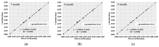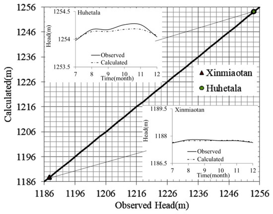 Through the accurate calibration of the measured and calculated water levels, the groundwater flow in HRB was successfully simulated. The actual observed groundwater level and flow field were mainly fitted by trial-and-error calibration, such that the simulated groundwater levels are reasonably coordinated with the observed values. The observed groundwater level data from July 2019 to December 2019 (184 days in total) were used for model calibration. To ensure that the dynamic change in the simulated groundwater level was as close as possible to the observed data, the hydrogeological parameters were constantly adjusted [55]. At the end of the simulation (184 days), no significant difference was observed between the simulated non-pressurized aquifer flow field and the measured groundwater flow field.