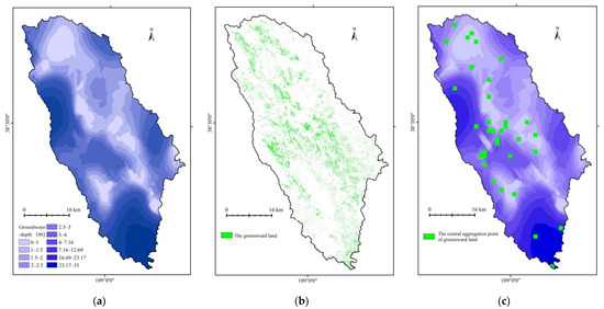 (a) Interpolation of groundwater depth in the watershed; (b) Distribution of greensward land use type in the watershed; (c) Location of the center of greensward land in the watershed (colors of the groundwater flow field are illuminated for contrast).