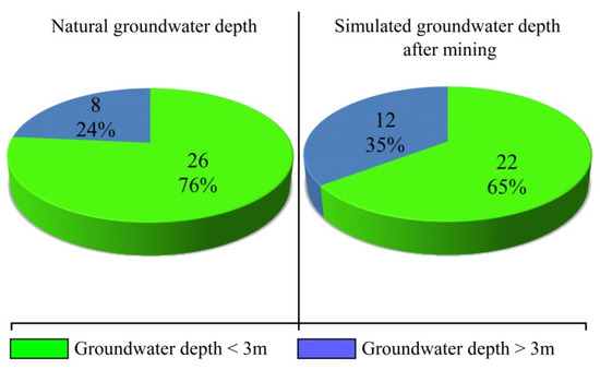 Using MODFLOW to predict the groundwater flow field in the basin after 10 years, we obtained the groundwater depth of the future basin, and central aggregation points of greensward land over the spatial distribution of groundwater depth were determined (Figure 10c). Compared with Figure 8b, the groundwater level in the first mining area of Yph decreased significantly, and the groundwater depth increased. The change of the flow field above the first mining area causes the increase in groundwater depth near the river, and this area is the central aggregation point of greensward land in the basin. The increase in groundwater depth will seriously affect the normal growth of grass vegetation. Therefore, these regions require serious attention. As mentioned earlier, the groundwater depth of 4 m is an important threshold. However, in order to take necessary measures before reaching the warning line, attention should be paid to affected areas when the groundwater depth drops below 3 m. Accordingly, the central aggregation point of greensward land in this region is marked as red to alert the government and local population of the degradation risk. By red tagging, four greensward degradation risk areas were found to be concentrated in the area and surroundings of Yph in the midstream of the basin. As clearly shown in Figure 11, the predicted groundwater depth in this area after coal mining exceeds 3 m, increasing the proportion central aggregation points with groundwater depth greater than 3 m to 35%. Although the greensward coverage near Dhz and Bls is small, and there is no major central aggregation point of the greensward land, attention should also be paid to the impact of groundwater level decline on ecological vegetation diversity. Finally, the prediction of groundwater and grassland coverage under multi-mining conditions shows that the overall ecological prospect of the basin is negative without the protection of the ecological environment. From the final research results, the change of groundwater in the next 10 years will affect only the growth of vegetation within a certain range. However, the influence of groundwater depth change caused by coal mining on natural vegetation should be carefully examined at the watershed scale.
