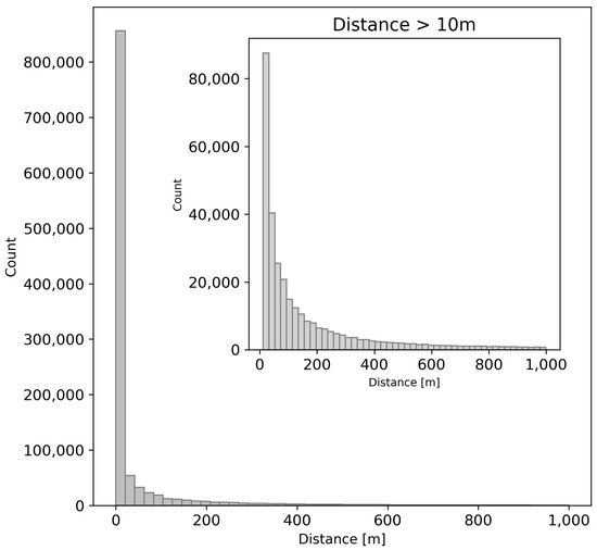 Distance between GPS measured and theoretical points (OBS_DIST attribute). A total of 35,509 points with a distance of more than 1000 m are not shown in this figure.