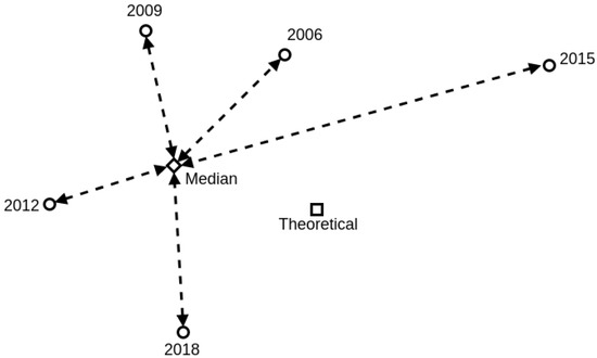 Therefore, we calculated the representative geometry as a geometric median of the repeated GPS measurements (Figure 2). The median was computed by the PostGIS function [45] using the Weiszfeld algorithm [46] to avoid the influence of possible outliers that are present. In addition, we introduced a new attribute (SURVEY_DIST, Appendix A Table A2), which measures the distance between the survey GPS coordinates and the geometric median coordinates. All the spatial coordinates (measured, theoretical, and median) were transformed to the common ETRS89-extended/LAEA Europe coordinate reference system (EPSG 3035).