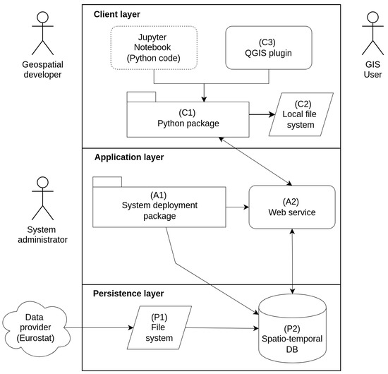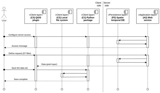 Figure 6 presents a UML sequential diagram of the user interaction process. This process is the interaction between the main components of the client side (CLI/GUI clients—C3, Python package—C1) and the server side represented by the application layer web service (A2) providing the data from the persistence layer (database system—P2). In addition, the users’ local file system (C2) is introduced in Figure 3 to illustrate the dynamic interaction with the ST_LUCAS system.