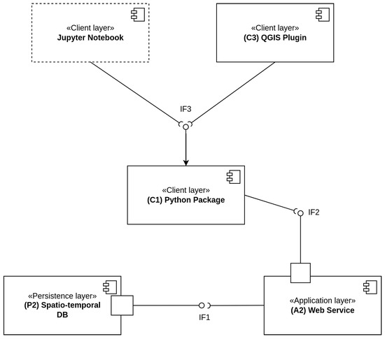 The overall system is designed as encapsulated individual software components, which provide a set of related functions. The software components communicate with each other via interfaces [48]. There are two types of interfaces: internal interfaces and external interfaces. The internal and external interfaces are illustrated using the UML component diagram in Figure 4. The internal interface provides communication between the persistence layer and the application layer (IF1). It is an interface between the database system and the web service using the OGC WFS specification where harmonized LUCAS data flow. The other internal interface provides communication between the application layer (web service) and the client Python package (IF2), which is defined by the OGC WFS specification. The external interfaces are between the client application (CLI or GUI) and the client layer Python package (IF3). Here, the web service sends requests to the spatio-temporal database and the service provides harmonized LUCAS data to the end users’ client in the form of the Geography Markup Language (GML) features. A QGIS plugin/Jupyter Notebook (client layer) communicates with the ST_LUCAS system via the Python package API. This interface provides the access and functionalities to retrieve and filter harmonized spatio-temporal LUCAS data subsets from the application layer.